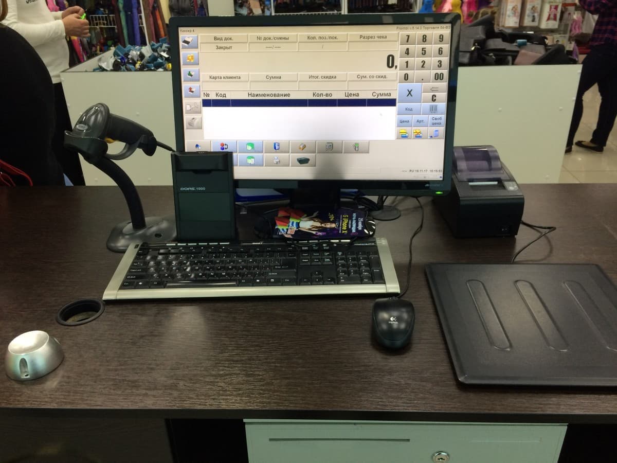 Гипермаркет одежды, обуви и аксессуаров в краснодарском ТК SBS MEGAMALL. Три кассовых рабочих места с программным обеспечением Frontol 5 Торговля 54-ФЗ и ККТ АТОЛ 55Ф. На компьютере товароведа — принтер этикеток TSC TDP-225 и Далион Управление магазином. ПРО